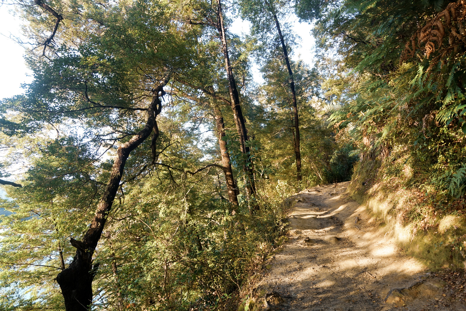 Lovely trail with trees curving upward from the steep slopes